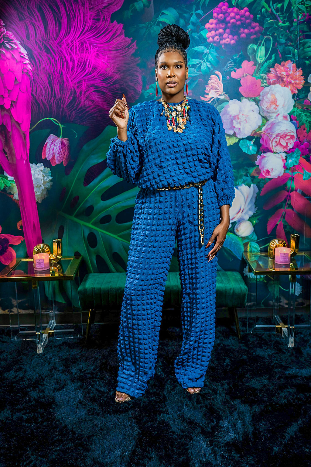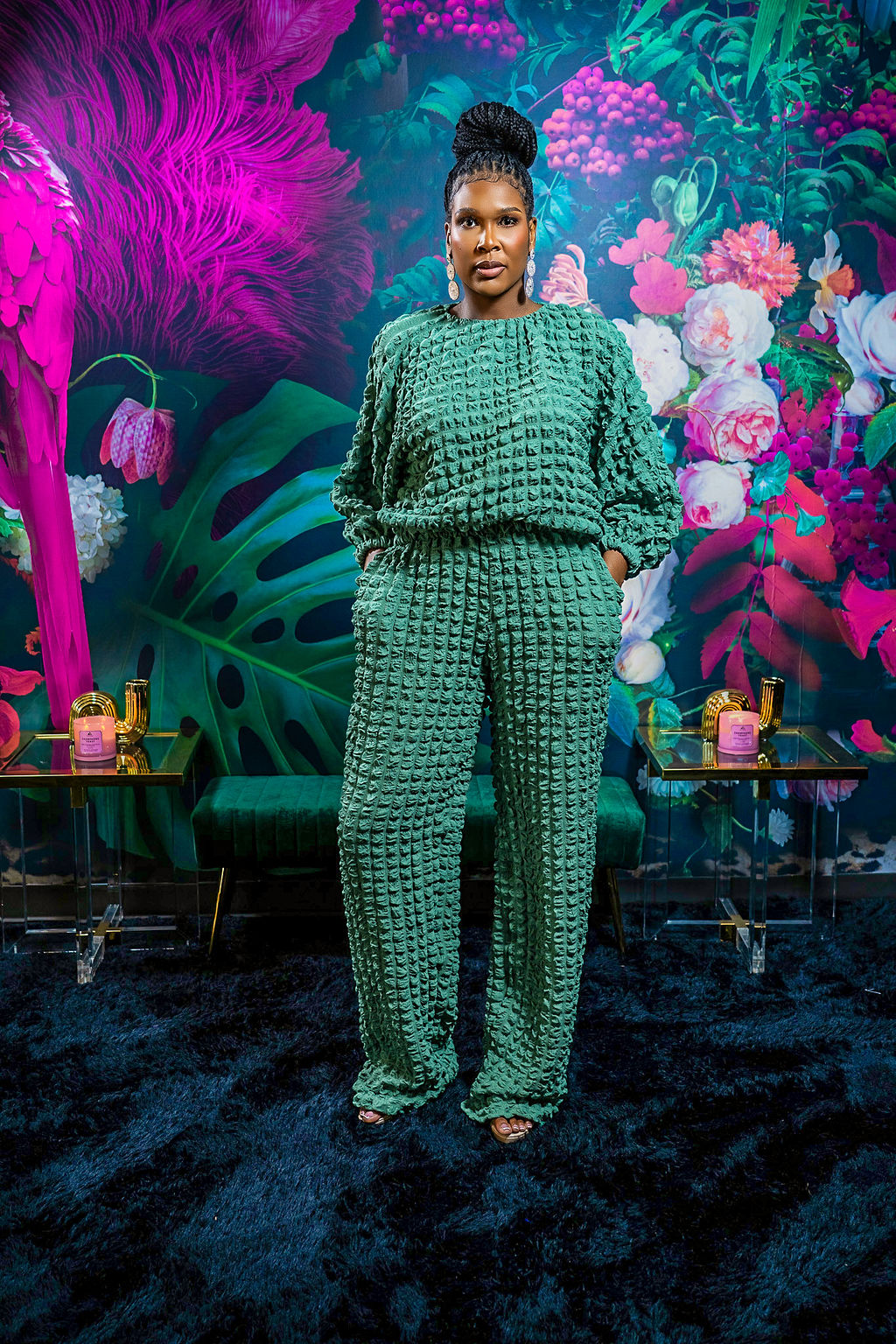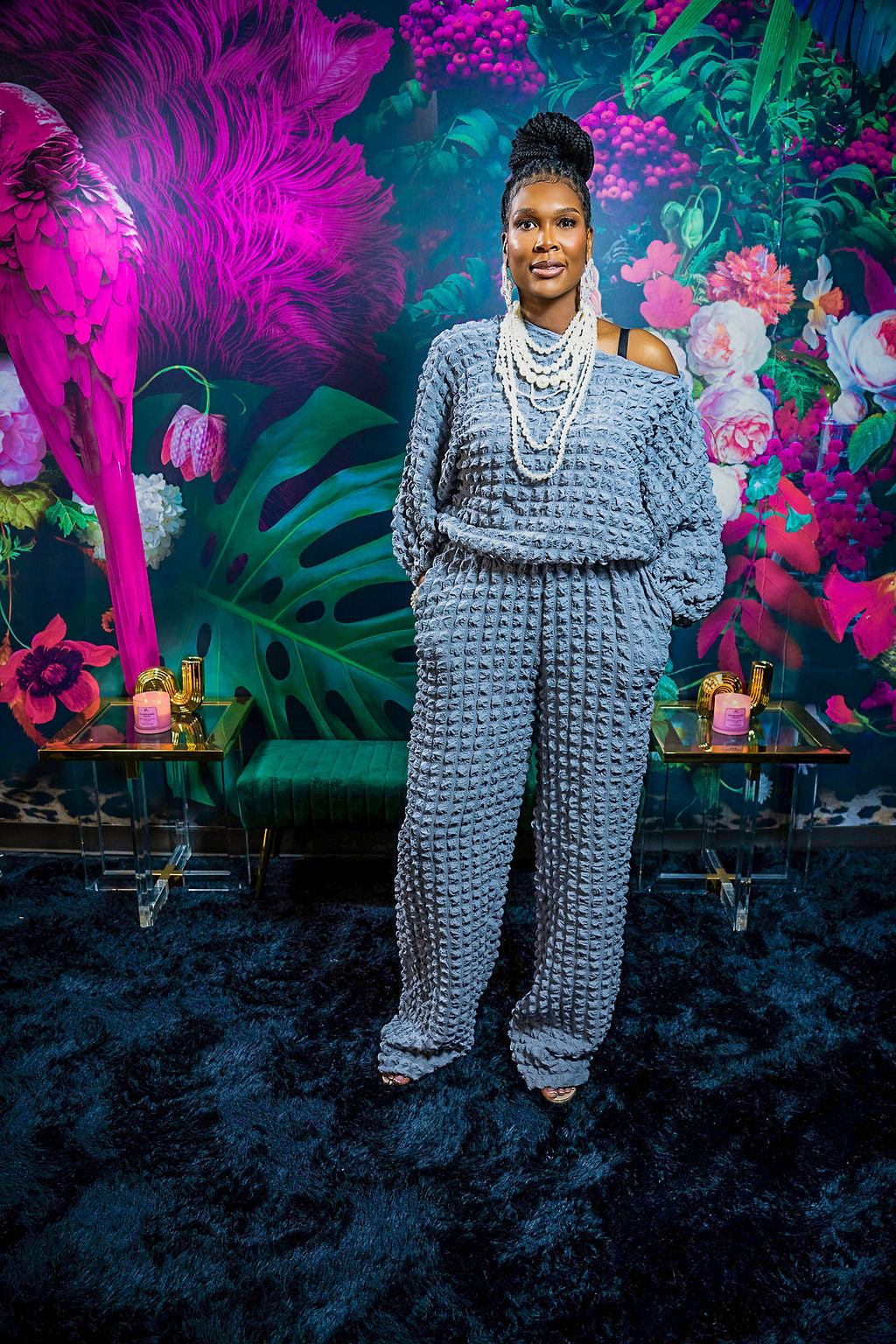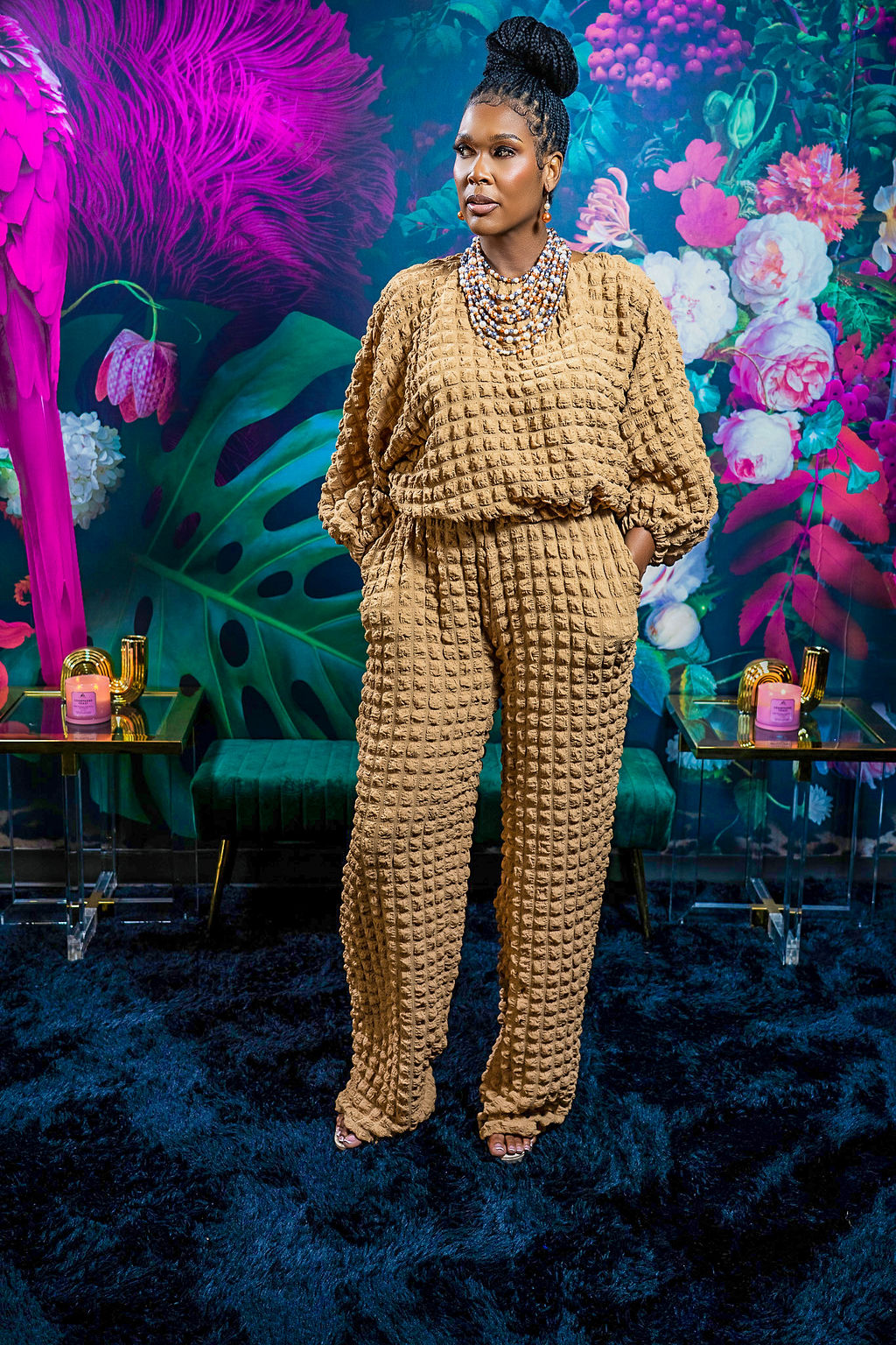 The Fall Back 2pc Set features a 37-inch inseam designed for tall women, offering a roomy fit with plenty of stretch for enhanced comfort. Made from 100% rayon, this set feels soft against the skin and includes practical pockets for convenience. The model, standing at 6'1", wears a size medium, showcasing its tailored fit that balances style and ease. Ideal for those seeking both comfort and functional design in their wardrobe.
